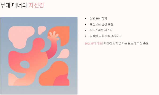 노래를 부를 때 시선을 바닥에 두거나 휴대폰 화면만 바라보면 긴장감을 숨기고자 하는 의도가 보이지만, 오히려 분위기가 가라앉게 됩니다. 대신 정면을 바라보거나 친구들을 향해 시선을 주면, 노래를 듣는 사람들이 함께 호흡하고 공감하게 됩니다. 눈빛과 표정으로 감정을 전달하면 단순히 소리로만 전달되는 노래보다 훨씬 더 몰입감 있는 공연처럼 느껴지게 됩니다.